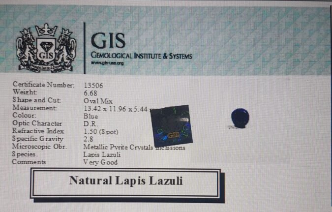 Beautiful 6.68 Ct. Lapis Lazuli (Afghanistan) Sava 7 Ratti Lapis Lazuli. Free Horoscope & Free Pundit Ji Advise / Consultation. Original Natural Lab certified gems by IGI GTL / Birth stones / Large Gem Selection of shree shubh Rashi Ratan Vedic dhan at Gem Mines. May Bhagwan Brahma, Vishnu, Shiv & Universe bless you.