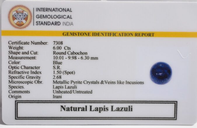 Beautiful 6 Cts Natural Lapis Lazuli (Top-Mines) sva 6+ Ratti LAPIS LAZULI. Free Horoscope & Free Pundit Ji Astrological Advise / Consultation. Original Natural Lab certified gems by IGI GTL / Birth stones / Large Gem Selection of shree shubh Rashi Ratan Vedic dhan at Gem Mines. May Bhagwan Brahma, Vishnu, Shiv & Universe bless you.