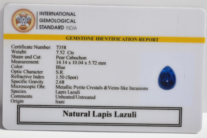 Certified Natural Lapis Lazuli 7.52 Ct.(8+ Ratti) in Pear Cabochon shape