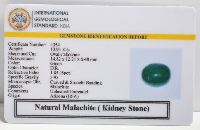 Beautiful 13.94 Cts Natural Malachite ( Kidney Stone) (Top+-Mines) sva 15+ Ratti MALACHITE. Free Horoscope & Free Pundit Ji Astrological Advise / Consultation. Original Natural Lab certified gems by IGI GTL / Birth stones / Large Gem Selection of shree shubh Rashi Ratan Vedic dhan at Gem Mines. May Bhagwan Brahma, Vishnu, Shiv & Universe bless you.