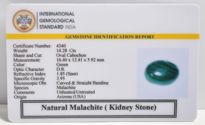Certified Natural Malachite ( Kidney Stone) 14.28 Ct.(15+ Ratti) in Oval Cabochon shape