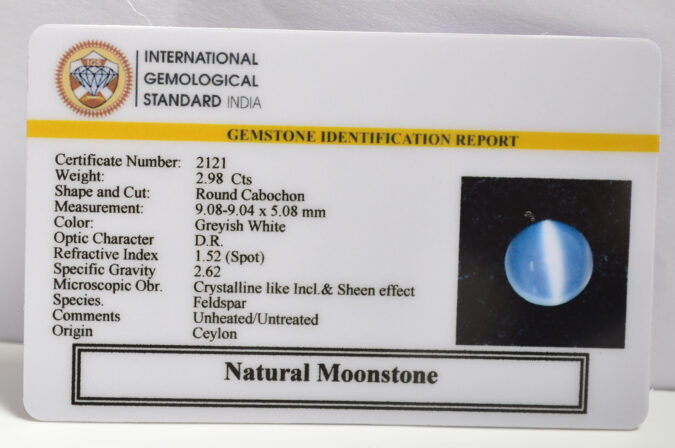 Beautiful 2.98 Cts Natural Moonstone (Top++-Mines) sva 3+ Ratti MOONSTONE. Free Horoscope & Free Pundit Ji Astrological Advise / Consultation. Original Natural Lab certified gems by IGI GTL / Birth stones / Large Gem Selection of shree shubh Rashi Ratan Vedic dhan at Gem Mines. May Bhagwan Brahma, Vishnu, Shiv & Universe bless you.