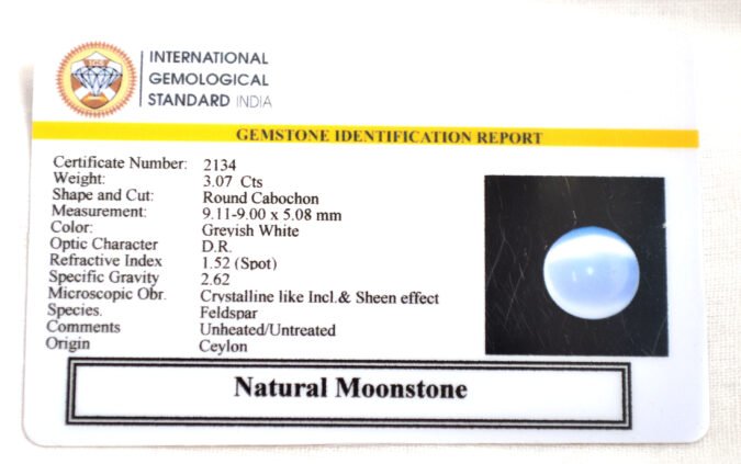 Beautiful 3.07 Cts Natural Moonstone (Top++-Mines) sva 3+ Ratti MOONSTONE. Free Horoscope & Free Pundit Ji Astrological Advise / Consultation. Original Natural Lab certified gems by IGI GTL / Birth stones / Large Gem Selection of shree shubh Rashi Ratan Vedic dhan at Gem Mines. May Bhagwan Brahma, Vishnu, Shiv & Universe bless you.