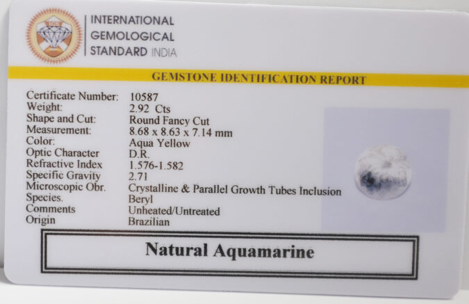Beautiful 2.92 Cts Natural Aquamarine (AAA+-Mines) sva 3+ Ratti NATURAL AQUAMARINE. Free Horoscope & Free Pundit Ji Astrological Advise / Consultation. Original Natural Lab certified gems by IGI GTL / Birth stones / Large Gem Selection of shree shubh Rashi Ratan Vedic dhan at Gem Mines. May Bhagwan Brahma, Vishnu, Shiv & Universe bless you.