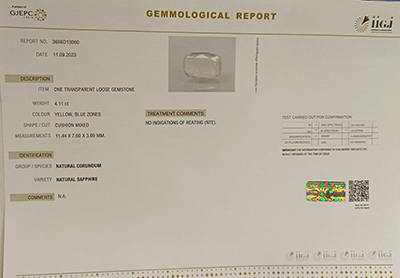 Beautiful 4.11 Ct. Natural Sapphire (AAA+-Mines) sva 4+ Ratti Nilambari Pitambari. Free Horoscope & Free Pundit Ji Astrological Advise / Consultation. Original Natural Lab certified gems by IGI GTL / Birth stones / Large Gem Selection of shree shubh Rashi Ratan Vedic dhan at Gem Mines. May Bhagwan Brahma, Vishnu, Shiv & Universe bless you.