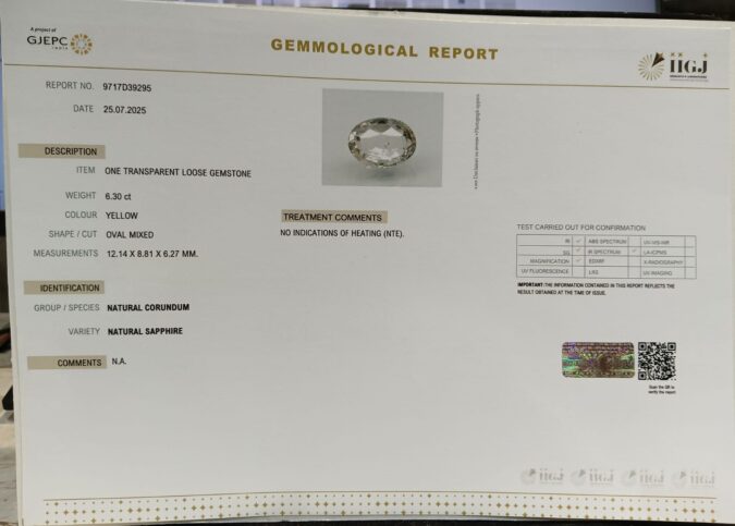 Beautiful 6.3 Cts Natural Yellow Sapphire (AAA+-Mines) sva 7+ Ratti NATURAL SAPPHIRE. Free Horoscope & Free Pundit Ji Astrological Advise / Consultation. Original Natural Lab certified gems by IGI GTL / Birth stones / Large Gem Selection of shree shubh Rashi Ratan Vedic dhan at Gem Mines. May Bhagwan Brahma, Vishnu, Shiv & Universe bless you.