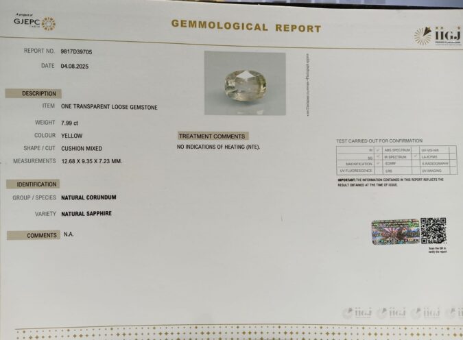 Beautiful 7.99 Cts Natural Yellow Sapphire (AAA+-Mines) sva 8+ Ratti NATURAL SAPPHIRE. Free Horoscope & Free Pundit Ji Astrological Advise / Consultation. Original Natural Lab certified gems by IGI GTL / Birth stones / Large Gem Selection of shree shubh Rashi Ratan Vedic dhan at Gem Mines. May Bhagwan Brahma, Vishnu, Shiv & Universe bless you.