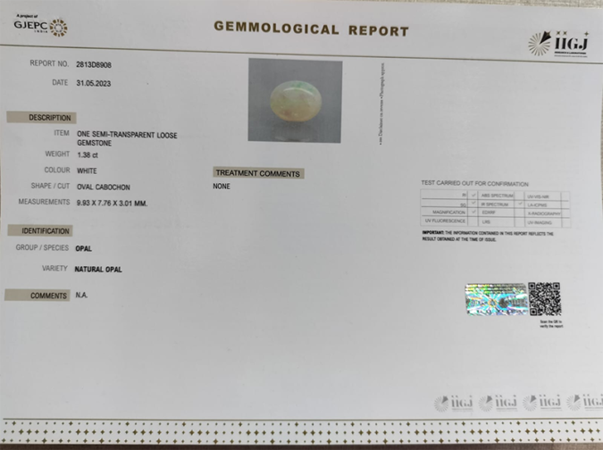 Beautiful 1.38 Ct. Natural Opal (TOP++-Mines) sva 1+ Ratti Dudhiya Pathar. Free Horoscope & Free Pundit Ji Astrological Advise / Consultation. Original Natural Lab certified gems by IGI GTL / Birth stones / Large Gem Selection of shree shubh Rashi Ratan Vedic dhan at Gem Mines. May Bhagwan Brahma, Vishnu, Shiv & Universe bless you.