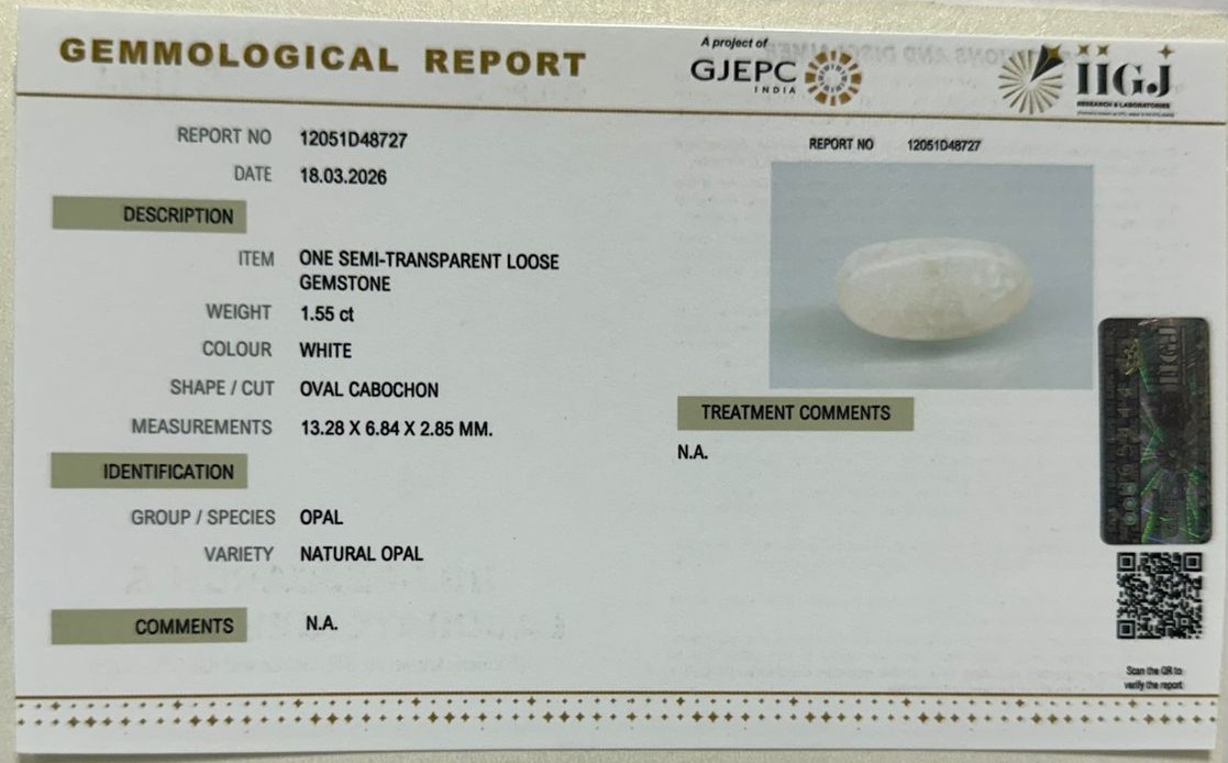 Beautiful 1.55 Cts Natural Opal (Very Good-Mines) sva 1+ Ratti OPAL. Free Horoscope & Free Pundit Ji Astrological Advise / Consultation. Original Natural Lab certified gems by IGI GTL / Birth stones / Large Gem Selection of shree shubh Rashi Ratan Vedic dhan at Gem Mines. May Bhagwan Brahma, Vishnu, Shiv & Universe bless you.