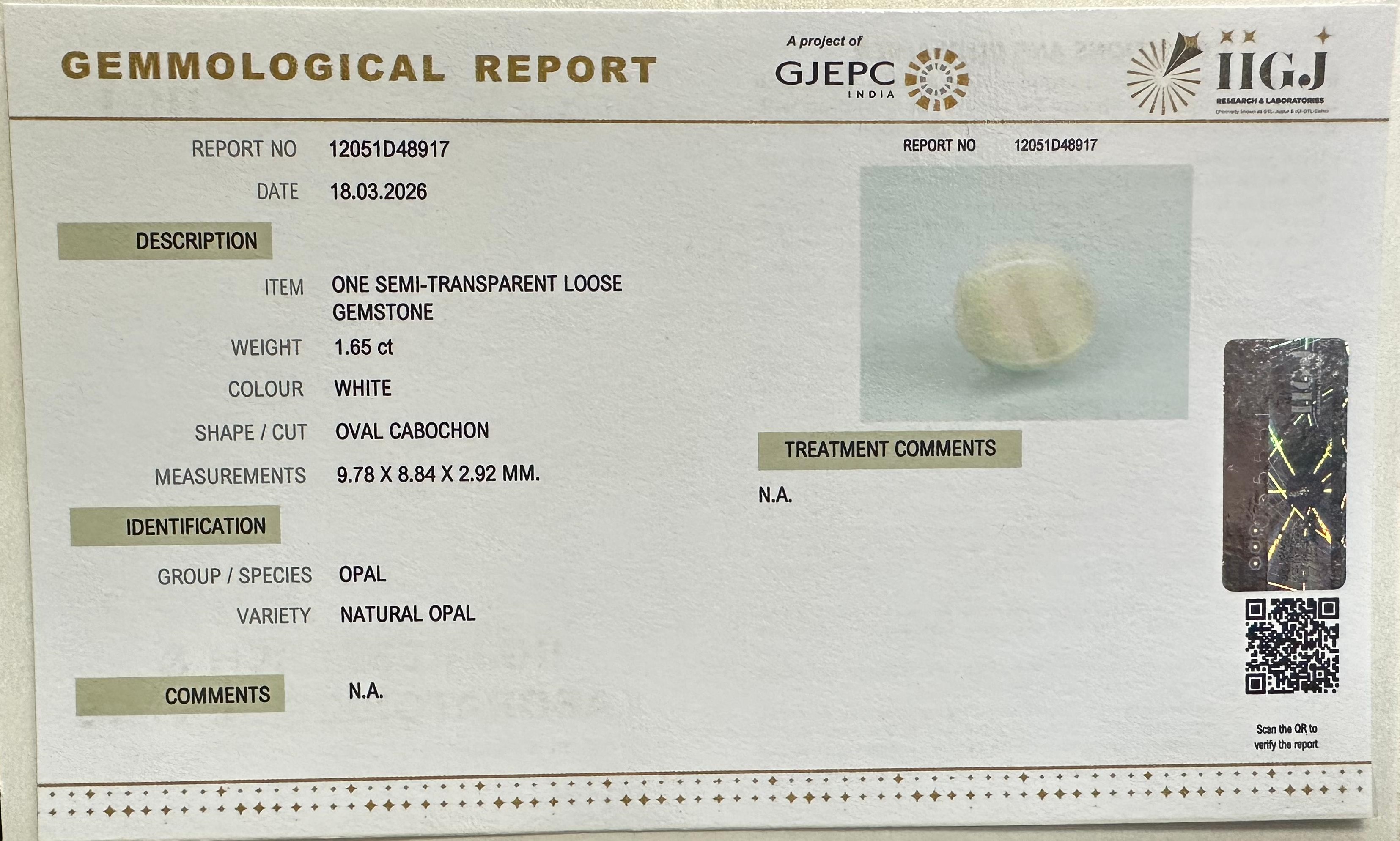 Beautiful 1.65 Cts Natural Opal (AAA+-Mines) sva 1+ Ratti OPAL. Free Horoscope & Free Pundit Ji Astrological Advise / Consultation. Original Natural Lab certified gems by IGI GTL / Birth stones / Large Gem Selection of shree shubh Rashi Ratan Vedic dhan at Gem Mines. May Bhagwan Brahma, Vishnu, Shiv & Universe bless you.