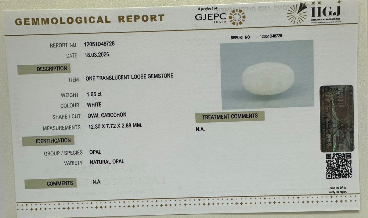 Beautiful 1.65 Cts Natural Opal (AAA+-Mines) sva 1+ Ratti OPAL. Free Horoscope & Free Pundit Ji Astrological Advise / Consultation. Original Natural Lab certified gems by IGI GTL / Birth stones / Large Gem Selection of shree shubh Rashi Ratan Vedic dhan at Gem Mines. May Bhagwan Brahma, Vishnu, Shiv & Universe bless you.