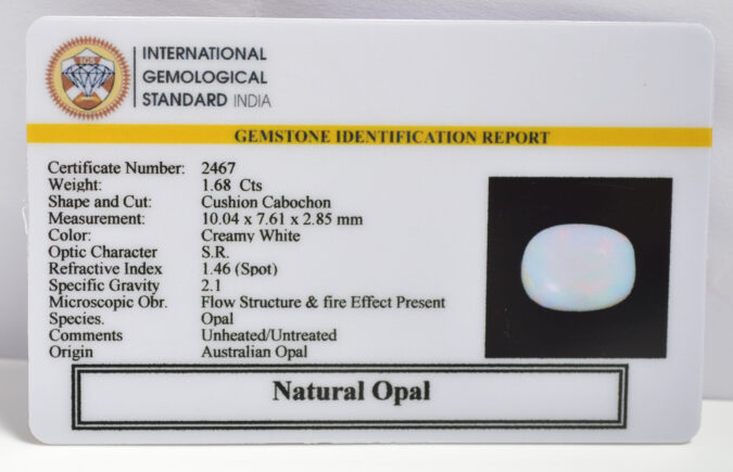 Beautiful 1.68 Cts Natural Opal (AAA-Mines) sva 1+ Ratti OPAL. Free Horoscope & Free Pundit Ji Astrological Advise / Consultation. Original Natural Lab certified gems by IGI GTL / Birth stones / Large Gem Selection of shree shubh Rashi Ratan Vedic dhan at Gem Mines. May Bhagwan Brahma, Vishnu, Shiv & Universe bless you.
