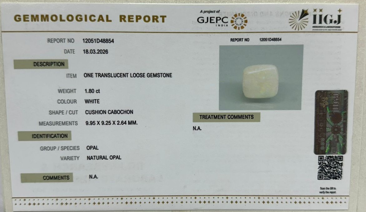Beautiful 1.8 Cts Natural Opal (Very Good-Mines) sva 2+ Ratti OPAL. Free Horoscope & Free Pundit Ji Astrological Advise / Consultation. Original Natural Lab certified gems by IGI GTL / Birth stones / Large Gem Selection of shree shubh Rashi Ratan Vedic dhan at Gem Mines. May Bhagwan Brahma, Vishnu, Shiv & Universe bless you.