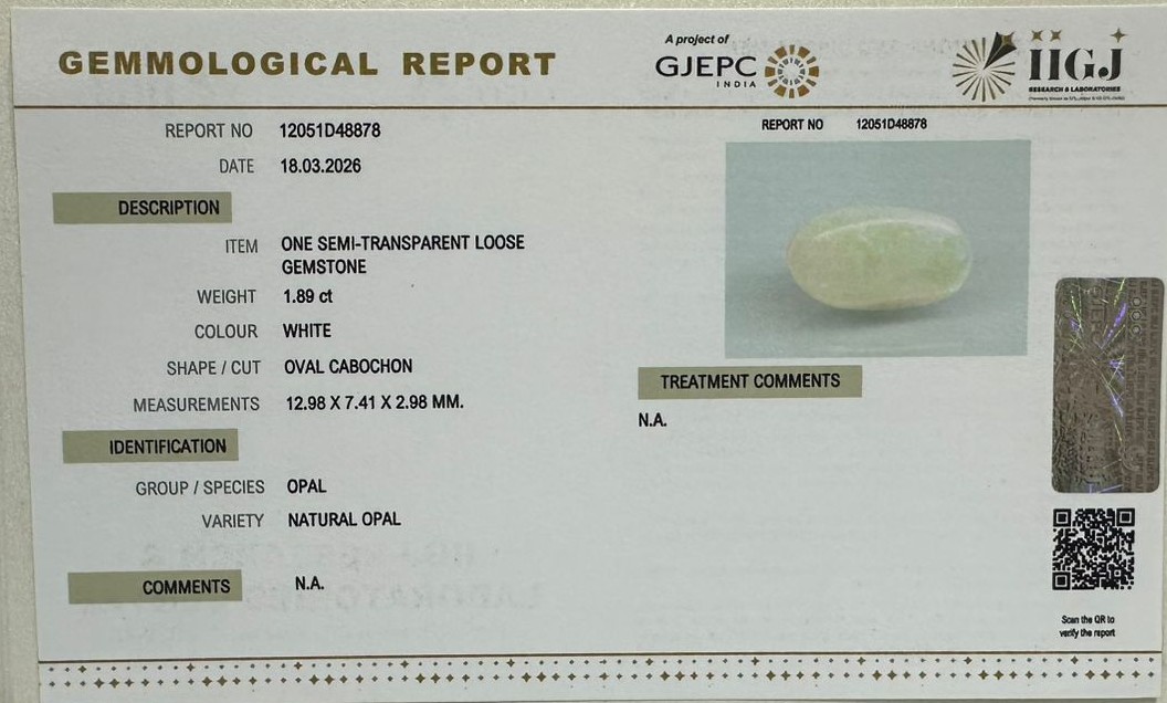 Beautiful 1.89 Cts Natural Opal (Top-Mines) sva 2+ Ratti OPAL. Free Horoscope & Free Pundit Ji Astrological Advise / Consultation. Original Natural Lab certified gems by IGI GTL / Birth stones / Large Gem Selection of shree shubh Rashi Ratan Vedic dhan at Gem Mines. May Bhagwan Brahma, Vishnu, Shiv & Universe bless you.