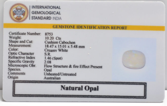 Beautiful 10.2 Cts Natural Opal (AAA+-Mines) sva 11+ Ratti OPAL. Free Horoscope & Free Pundit Ji Astrological Advise / Consultation. Original Natural Lab certified gems by IGI GTL / Birth stones / Large Gem Selection of shree shubh Rashi Ratan Vedic dhan at Gem Mines. May Bhagwan Brahma, Vishnu, Shiv & Universe bless you.