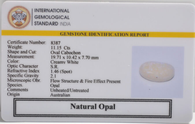 Beautiful 11.15 Cts Natural Opal (AAA-Mines) sva 12+ Ratti OPAL. Free Horoscope & Free Pundit Ji Astrological Advise / Consultation. Original Natural Lab certified gems by IGI GTL / Birth stones / Large Gem Selection of shree shubh Rashi Ratan Vedic dhan at Gem Mines. May Bhagwan Brahma, Vishnu, Shiv & Universe bless you.
