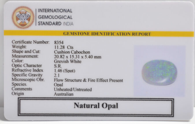 Beautiful 11.28 Cts Natural Opal (AAA-Mines) sva 12+ Ratti OPAL. Free Horoscope & Free Pundit Ji Astrological Advise / Consultation. Original Natural Lab certified gems by IGI GTL / Birth stones / Large Gem Selection of shree shubh Rashi Ratan Vedic dhan at Gem Mines. May Bhagwan Brahma, Vishnu, Shiv & Universe bless you.
