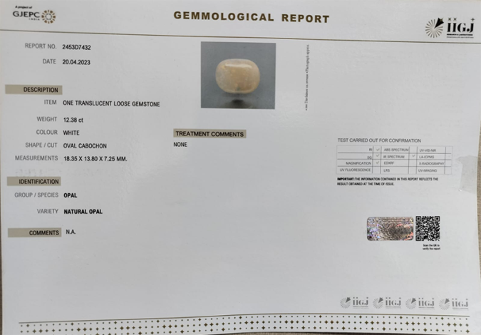 Beautiful 12.38 Ct. Natural Opal (Top++-Mines) sva 13+ Ratti Dudhiya Pathar. Free Horoscope & Free Pundit Ji Astrological Advise / Consultation. Original Natural Lab certified gems by IGI GTL / Birth stones / Large Gem Selection of shree shubh Rashi Ratan Vedic dhan at Gem Mines. May Bhagwan Brahma, Vishnu, Shiv & Universe bless you.
