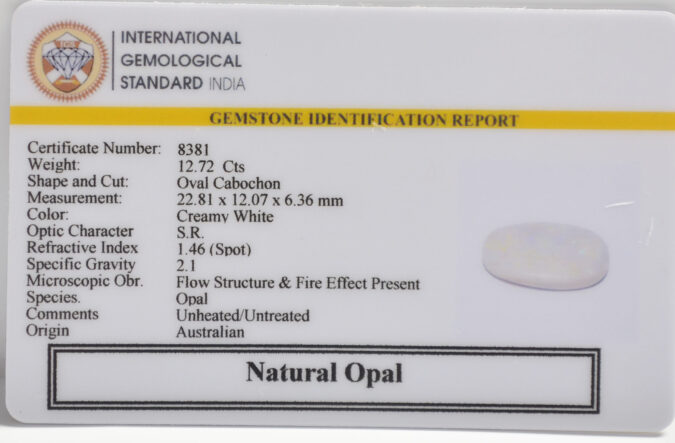 Beautiful 12.72 Cts Natural Opal (AAA-Mines) sva 14+ Ratti OPAL. Free Horoscope & Free Pundit Ji Astrological Advise / Consultation. Original Natural Lab certified gems by IGI GTL / Birth stones / Large Gem Selection of shree shubh Rashi Ratan Vedic dhan at Gem Mines. May Bhagwan Brahma, Vishnu, Shiv & Universe bless you.