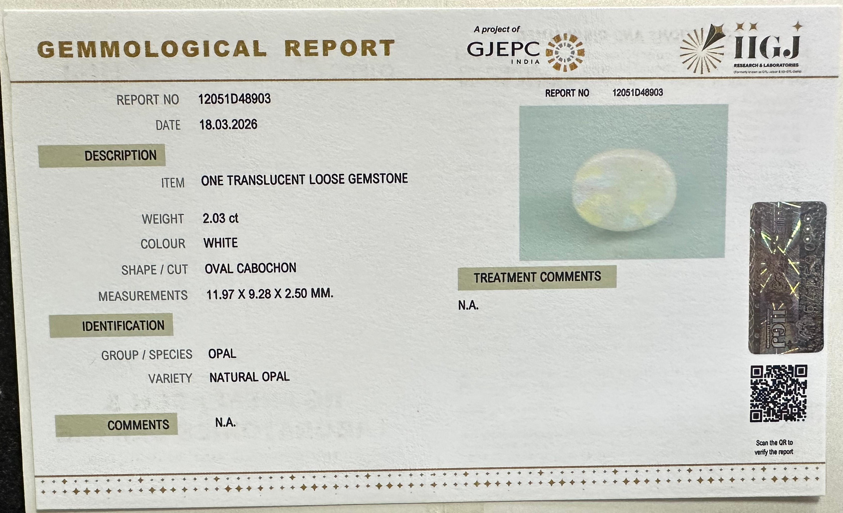 Beautiful 2.03 Cts Natural Opal (Top-Mines) sva 2+ Ratti OPAL. Free Horoscope & Free Pundit Ji Astrological Advise / Consultation. Original Natural Lab certified gems by IGI GTL / Birth stones / Large Gem Selection of shree shubh Rashi Ratan Vedic dhan at Gem Mines. May Bhagwan Brahma, Vishnu, Shiv & Universe bless you.