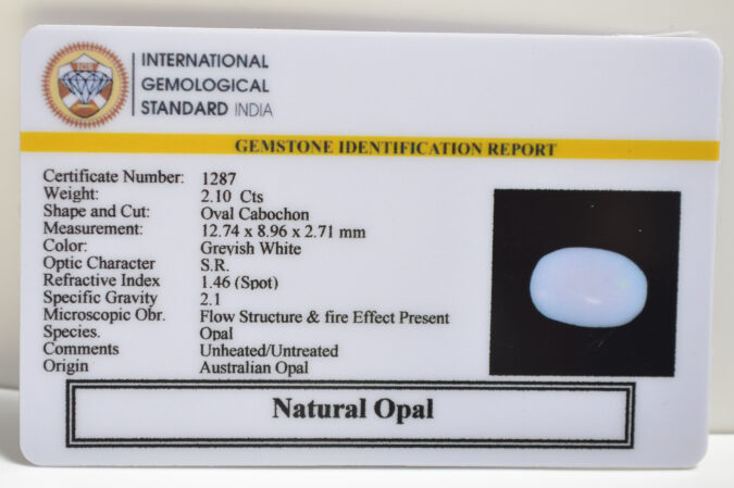 Beautiful 2.1 Cts Natural Opal (AAA+-Mines) sva 2+ Ratti OPAL. Free Horoscope & Free Pundit Ji Astrological Advise / Consultation. Original Natural Lab certified gems by IGI GTL / Birth stones / Large Gem Selection of shree shubh Rashi Ratan Vedic dhan at Gem Mines. May Bhagwan Brahma, Vishnu, Shiv & Universe bless you.
