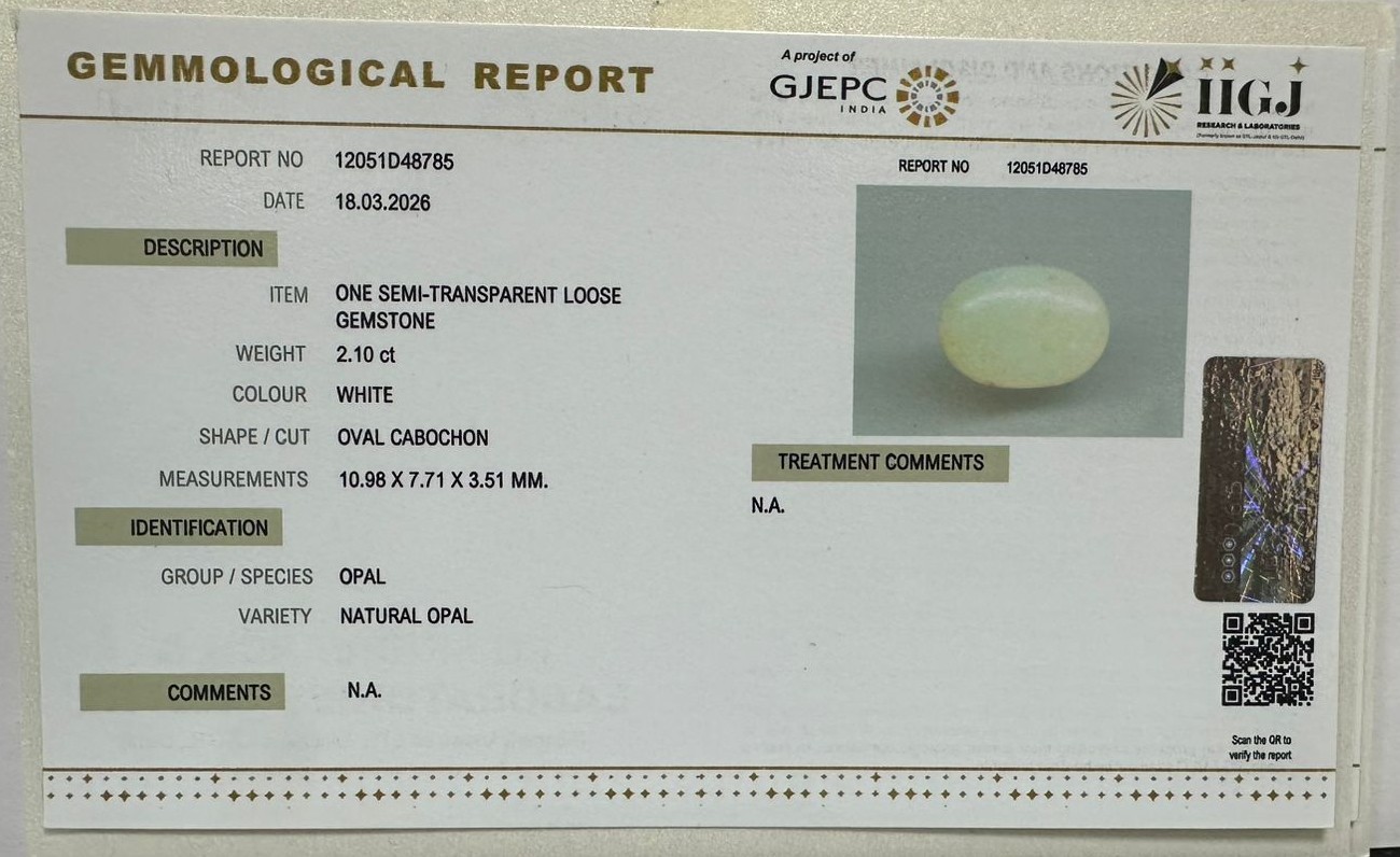 Beautiful 2.1 Cts Natural Opal (Top-Mines) sva 2+ Ratti OPAL. Free Horoscope & Free Pundit Ji Astrological Advise / Consultation. Original Natural Lab certified gems by IGI GTL / Birth stones / Large Gem Selection of shree shubh Rashi Ratan Vedic dhan at Gem Mines. May Bhagwan Brahma, Vishnu, Shiv & Universe bless you.
