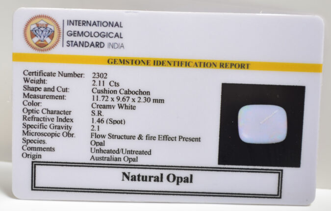 Beautiful 2.11 Cts Natural Opal (Top-Mines) sva 2+ Ratti OPAL. Free Horoscope & Free Pundit Ji Astrological Advise / Consultation. Original Natural Lab certified gems by IGI GTL / Birth stones / Large Gem Selection of shree shubh Rashi Ratan Vedic dhan at Gem Mines. May Bhagwan Brahma, Vishnu, Shiv & Universe bless you.