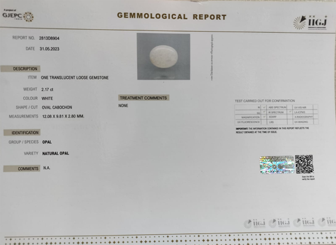 Beautiful 2.17 Ct. Natural Opal (TOP++-Mines) sva 2+ Ratti Dudhiya Pathar. Free Horoscope & Free Pundit Ji Astrological Advise / Consultation. Original Natural Lab certified gems by IGI GTL / Birth stones / Large Gem Selection of shree shubh Rashi Ratan Vedic dhan at Gem Mines. May Bhagwan Brahma, Vishnu, Shiv & Universe bless you.