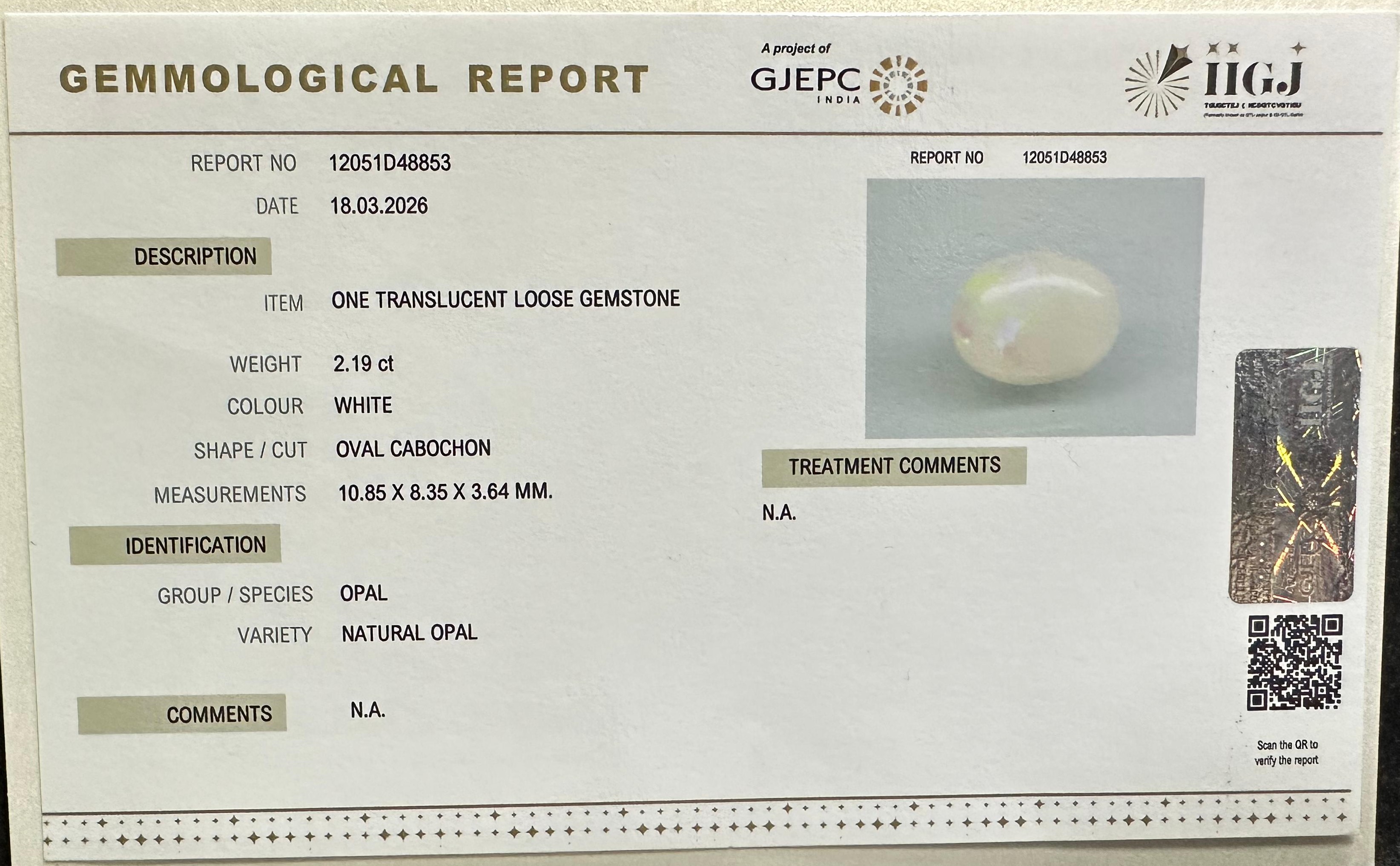 Beautiful 2.19 Cts Natural Opal (Very Good-Mines) sva 2+ Ratti OPAL. Free Horoscope & Free Pundit Ji Astrological Advise / Consultation. Original Natural Lab certified gems by IGI GTL / Birth stones / Large Gem Selection of shree shubh Rashi Ratan Vedic dhan at Gem Mines. May Bhagwan Brahma, Vishnu, Shiv & Universe bless you.