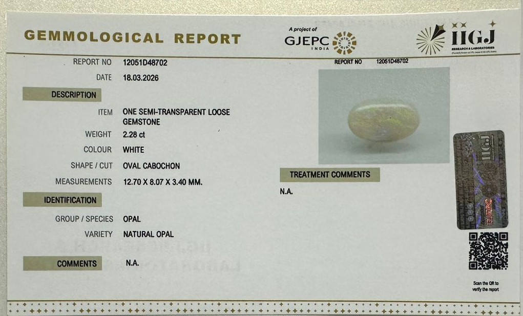 Beautiful 2.28 Cts Natural Opal (Top-Mines) sva 2+ Ratti OPAL. Free Horoscope & Free Pundit Ji Astrological Advise / Consultation. Original Natural Lab certified gems by IGI GTL / Birth stones / Large Gem Selection of shree shubh Rashi Ratan Vedic dhan at Gem Mines. May Bhagwan Brahma, Vishnu, Shiv & Universe bless you.
