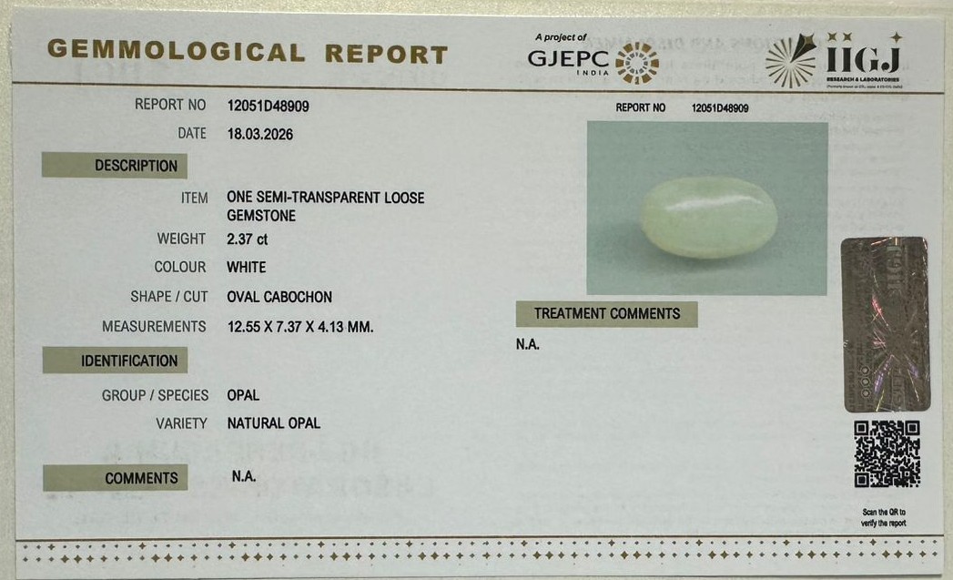 Beautiful 2.37 Cts Natural Opal (AAA+-Mines) sva 2+ Ratti OPAL. Free Horoscope & Free Pundit Ji Astrological Advise / Consultation. Original Natural Lab certified gems by IGI GTL / Birth stones / Large Gem Selection of shree shubh Rashi Ratan Vedic dhan at Gem Mines. May Bhagwan Brahma, Vishnu, Shiv & Universe bless you.