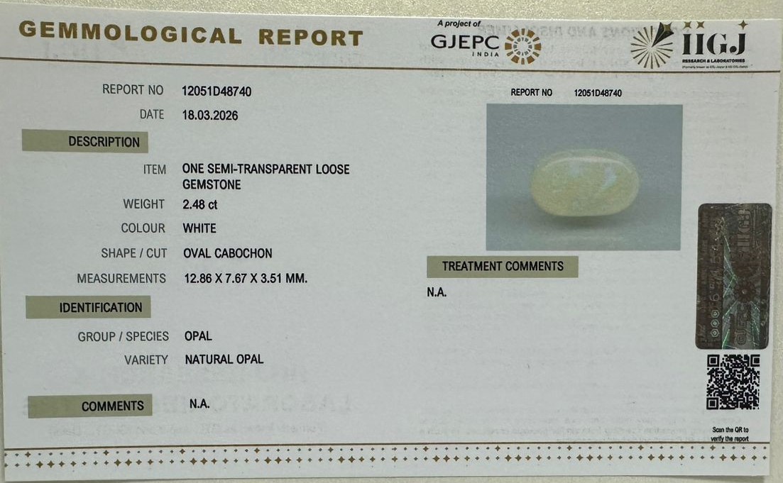 Beautiful 2.48 Cts Natural Opal (AAA+-Mines) sva 2+ Ratti OPAL. Free Horoscope & Free Pundit Ji Astrological Advise / Consultation. Original Natural Lab certified gems by IGI GTL / Birth stones / Large Gem Selection of shree shubh Rashi Ratan Vedic dhan at Gem Mines. May Bhagwan Brahma, Vishnu, Shiv & Universe bless you.