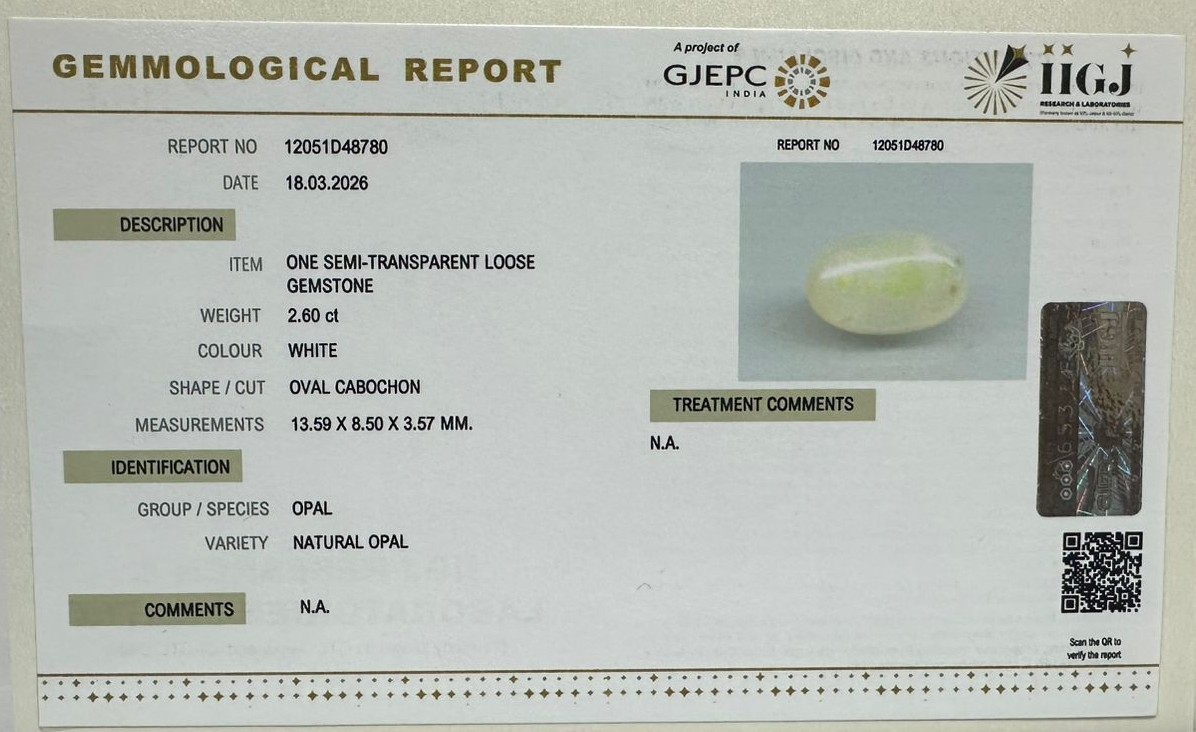 Beautiful 2.6 Cts Natural Opal (Top-Mines) sva 2+ Ratti OPAL. Free Horoscope & Free Pundit Ji Astrological Advise / Consultation. Original Natural Lab certified gems by IGI GTL / Birth stones / Large Gem Selection of shree shubh Rashi Ratan Vedic dhan at Gem Mines. May Bhagwan Brahma, Vishnu, Shiv & Universe bless you.