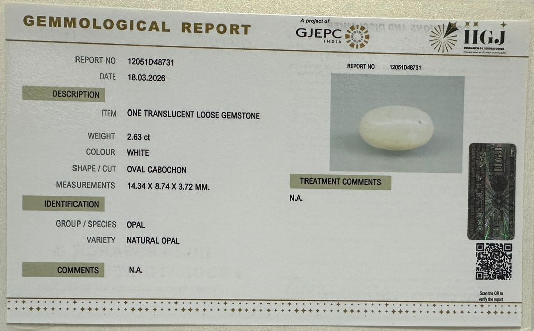 Beautiful 2.63 Cts Natural Opal (AAA+-Mines) sva 2+ Ratti OPAL. Free Horoscope & Free Pundit Ji Astrological Advise / Consultation. Original Natural Lab certified gems by IGI GTL / Birth stones / Large Gem Selection of shree shubh Rashi Ratan Vedic dhan at Gem Mines. May Bhagwan Brahma, Vishnu, Shiv & Universe bless you.