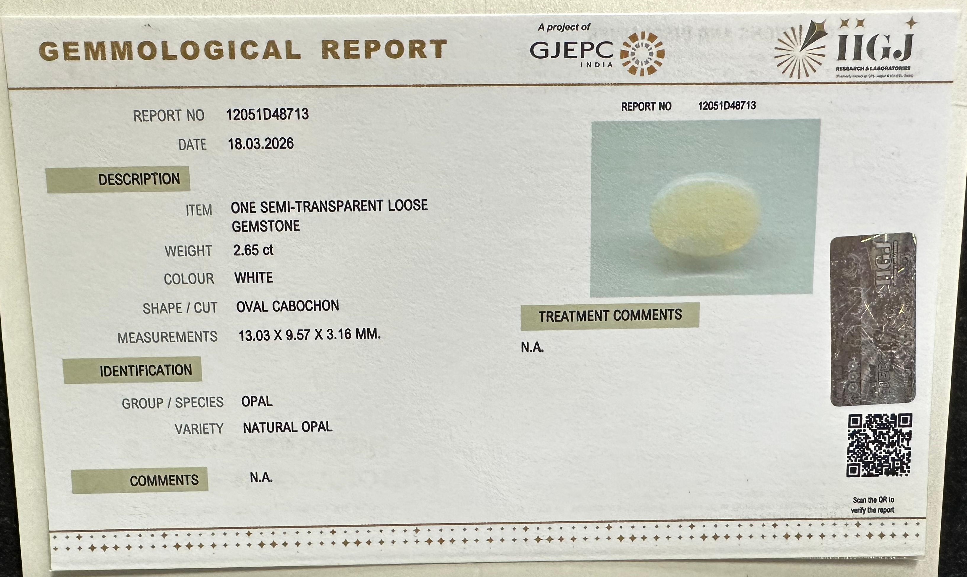 Beautiful 2.65 Cts Natural Opal (AAA+-Mines) sva 2+ Ratti OPAL. Free Horoscope & Free Pundit Ji Astrological Advise / Consultation. Original Natural Lab certified gems by IGI GTL / Birth stones / Large Gem Selection of shree shubh Rashi Ratan Vedic dhan at Gem Mines. May Bhagwan Brahma, Vishnu, Shiv & Universe bless you.