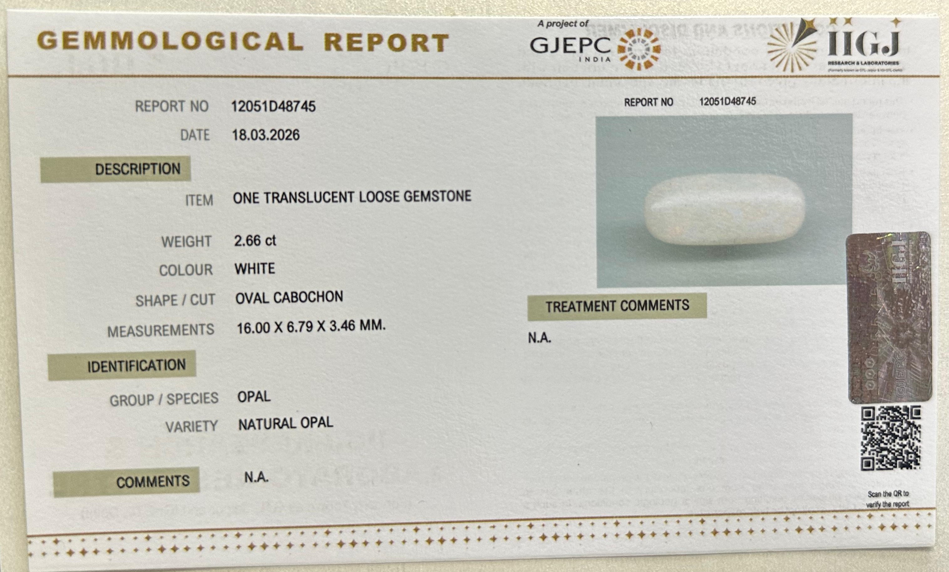 Beautiful 2.66 Cts Natural Opal (Top-Mines) sva 2+ Ratti OPAL. Free Horoscope & Free Pundit Ji Astrological Advise / Consultation. Original Natural Lab certified gems by IGI GTL / Birth stones / Large Gem Selection of shree shubh Rashi Ratan Vedic dhan at Gem Mines. May Bhagwan Brahma, Vishnu, Shiv & Universe bless you.