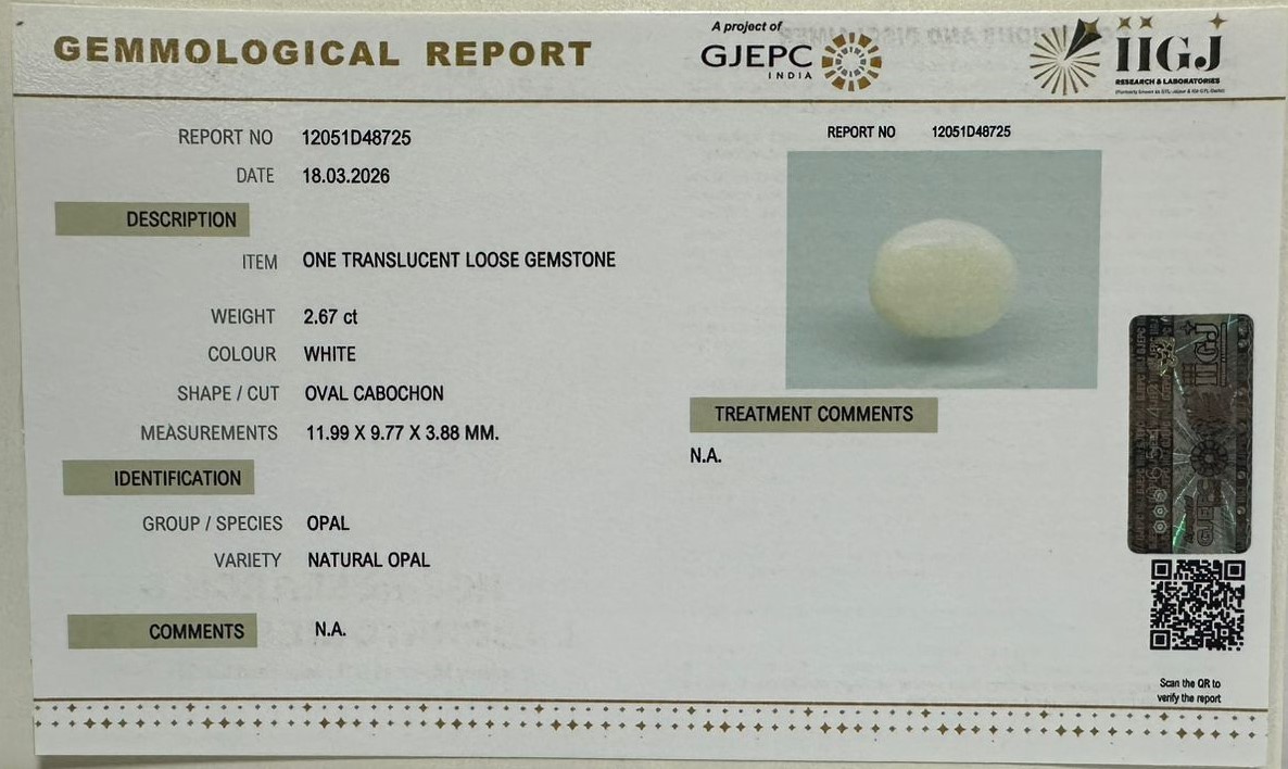 Beautiful 2.67 Cts Natural Opal (Top-Mines) sva 2+ Ratti OPAL. Free Horoscope & Free Pundit Ji Astrological Advise / Consultation. Original Natural Lab certified gems by IGI GTL / Birth stones / Large Gem Selection of shree shubh Rashi Ratan Vedic dhan at Gem Mines. May Bhagwan Brahma, Vishnu, Shiv & Universe bless you.