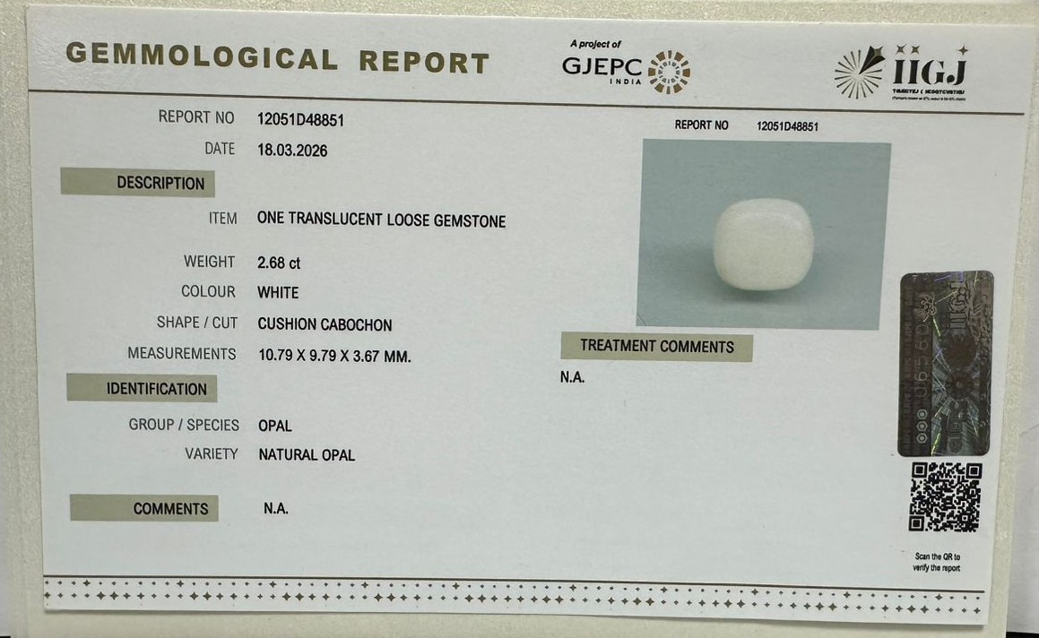 Beautiful 2.68 Cts Natural Opal (Very Good-Mines) sva 2+ Ratti OPAL. Free Horoscope & Free Pundit Ji Astrological Advise / Consultation. Original Natural Lab certified gems by IGI GTL / Birth stones / Large Gem Selection of shree shubh Rashi Ratan Vedic dhan at Gem Mines. May Bhagwan Brahma, Vishnu, Shiv & Universe bless you.
