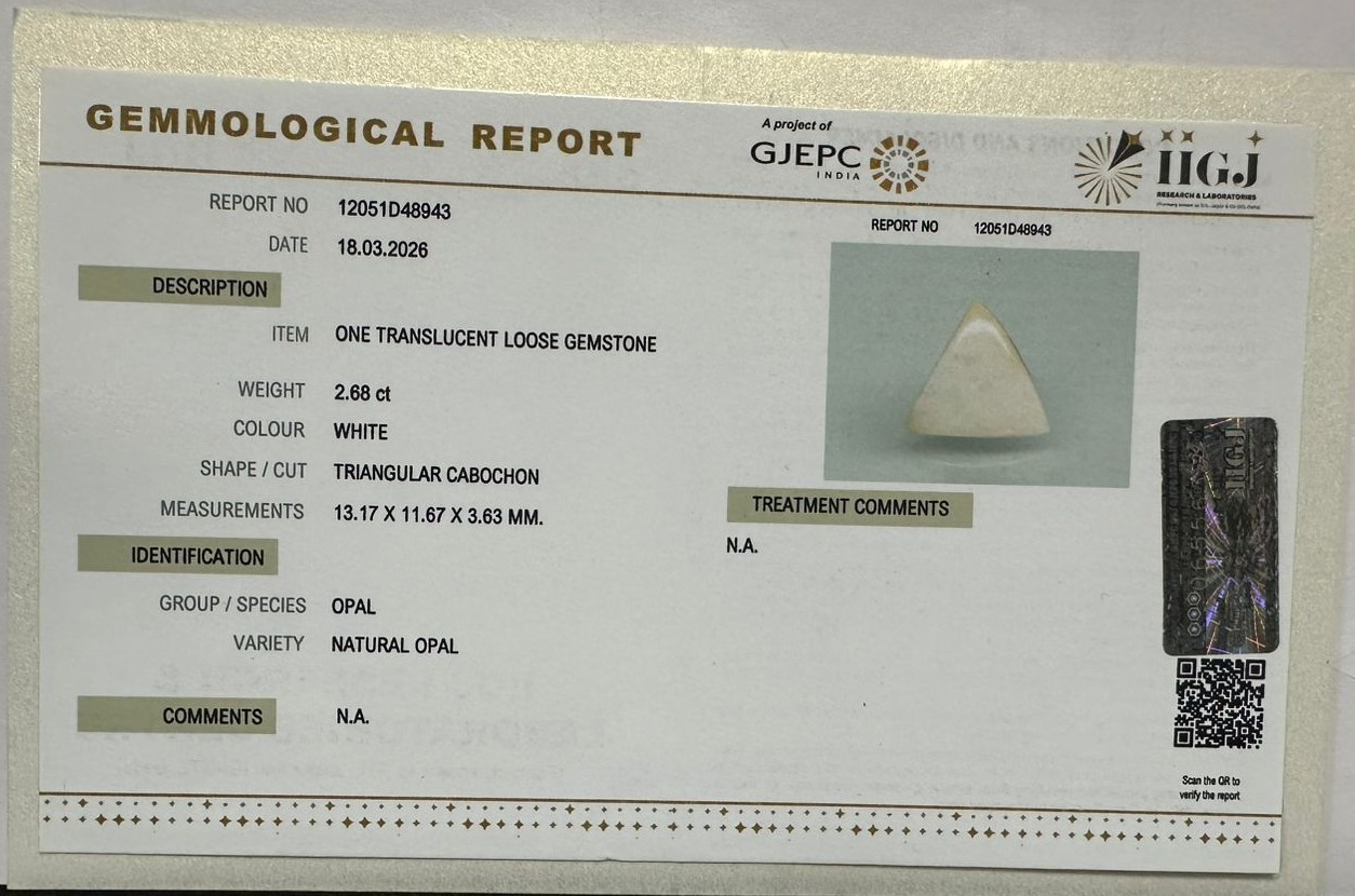 Beautiful 2.68 Cts Natural Opal (Top-Mines) sva 2+ Ratti OPAL. Free Horoscope & Free Pundit Ji Astrological Advise / Consultation. Original Natural Lab certified gems by IGI GTL / Birth stones / Large Gem Selection of shree shubh Rashi Ratan Vedic dhan at Gem Mines. May Bhagwan Brahma, Vishnu, Shiv & Universe bless you.