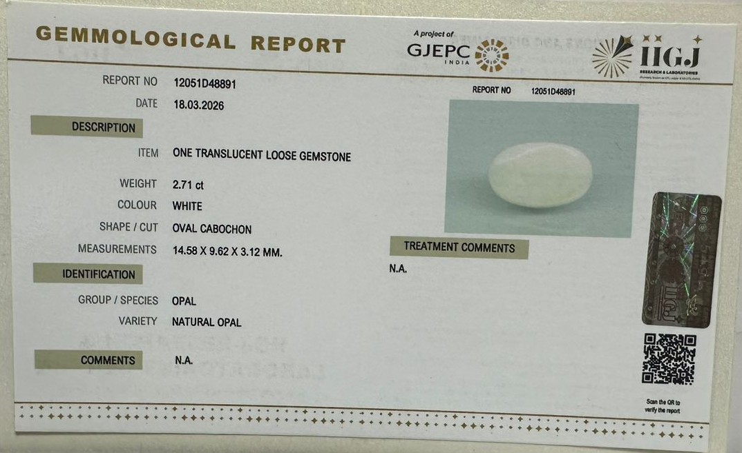 Beautiful 2.71 Cts Natural Opal (AAA+-Mines) sva 3+ Ratti OPAL. Free Horoscope & Free Pundit Ji Astrological Advise / Consultation. Original Natural Lab certified gems by IGI GTL / Birth stones / Large Gem Selection of shree shubh Rashi Ratan Vedic dhan at Gem Mines. May Bhagwan Brahma, Vishnu, Shiv & Universe bless you.