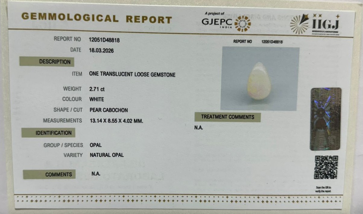 Beautiful 2.71 Cts Natural Opal (AAA+-Mines) sva 3+ Ratti OPAL. Free Horoscope & Free Pundit Ji Astrological Advise / Consultation. Original Natural Lab certified gems by IGI GTL / Birth stones / Large Gem Selection of shree shubh Rashi Ratan Vedic dhan at Gem Mines. May Bhagwan Brahma, Vishnu, Shiv & Universe bless you.