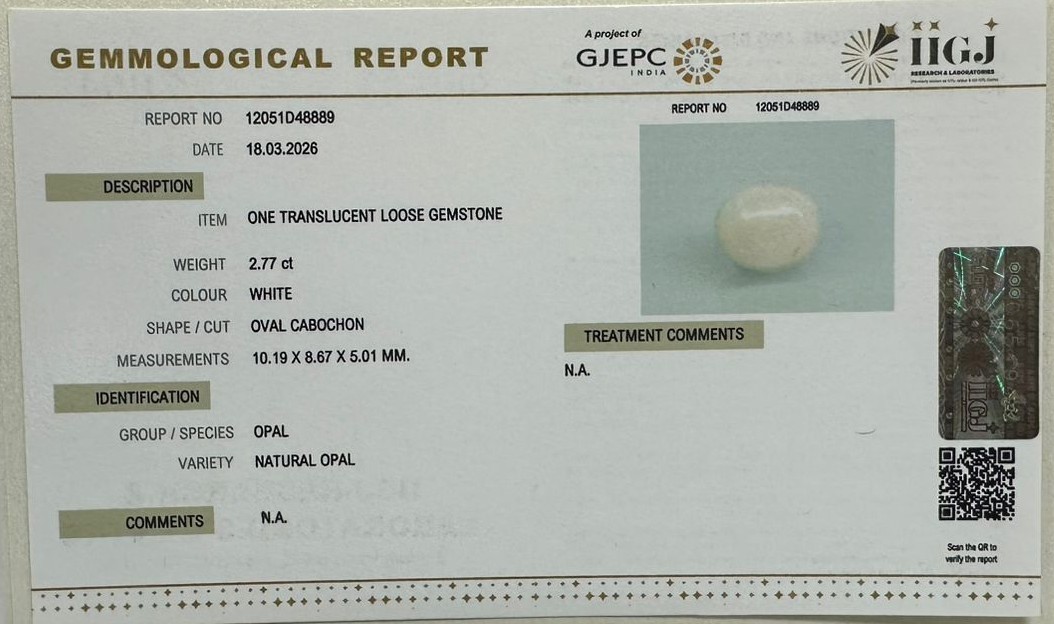 Beautiful 2.77 Cts Natural Opal (Top-Mines) sva 3+ Ratti OPAL. Free Horoscope & Free Pundit Ji Astrological Advise / Consultation. Original Natural Lab certified gems by IGI GTL / Birth stones / Large Gem Selection of shree shubh Rashi Ratan Vedic dhan at Gem Mines. May Bhagwan Brahma, Vishnu, Shiv & Universe bless you.