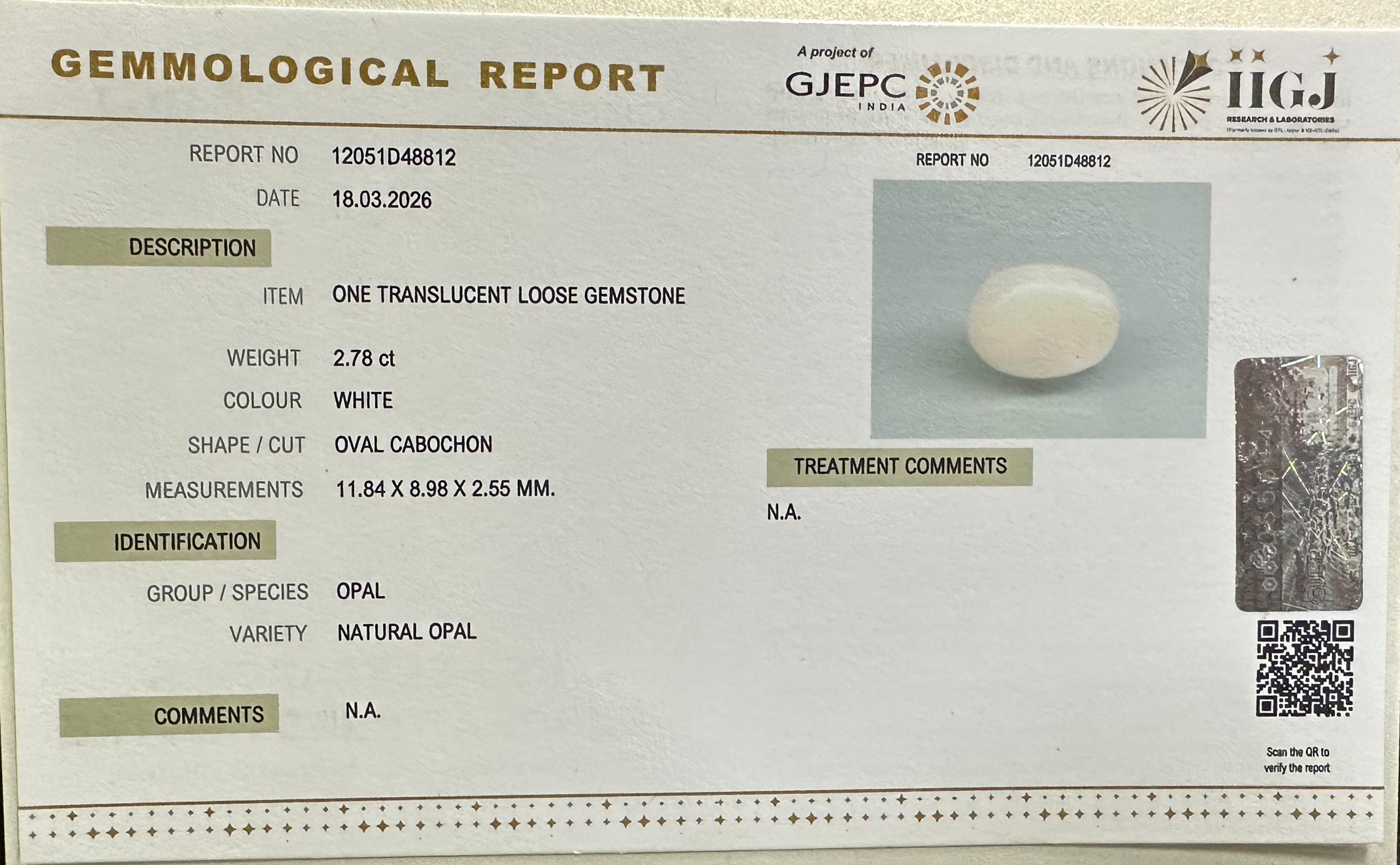 Beautiful 2.78 Cts Natural Opal (Top-Mines) sva 3+ Ratti OPAL. Free Horoscope & Free Pundit Ji Astrological Advise / Consultation. Original Natural Lab certified gems by IGI GTL / Birth stones / Large Gem Selection of shree shubh Rashi Ratan Vedic dhan at Gem Mines. May Bhagwan Brahma, Vishnu, Shiv & Universe bless you.