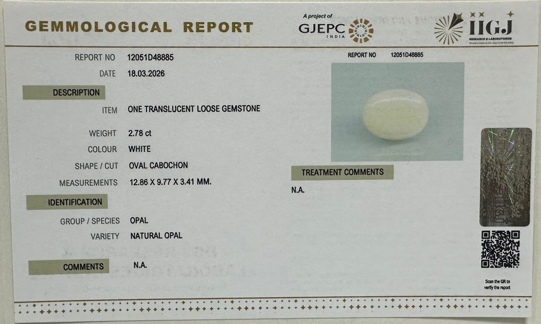 Beautiful 2.78 Cts Natural Opal (AAA+-Mines) sva 3+ Ratti OPAL. Free Horoscope & Free Pundit Ji Astrological Advise / Consultation. Original Natural Lab certified gems by IGI GTL / Birth stones / Large Gem Selection of shree shubh Rashi Ratan Vedic dhan at Gem Mines. May Bhagwan Brahma, Vishnu, Shiv & Universe bless you.