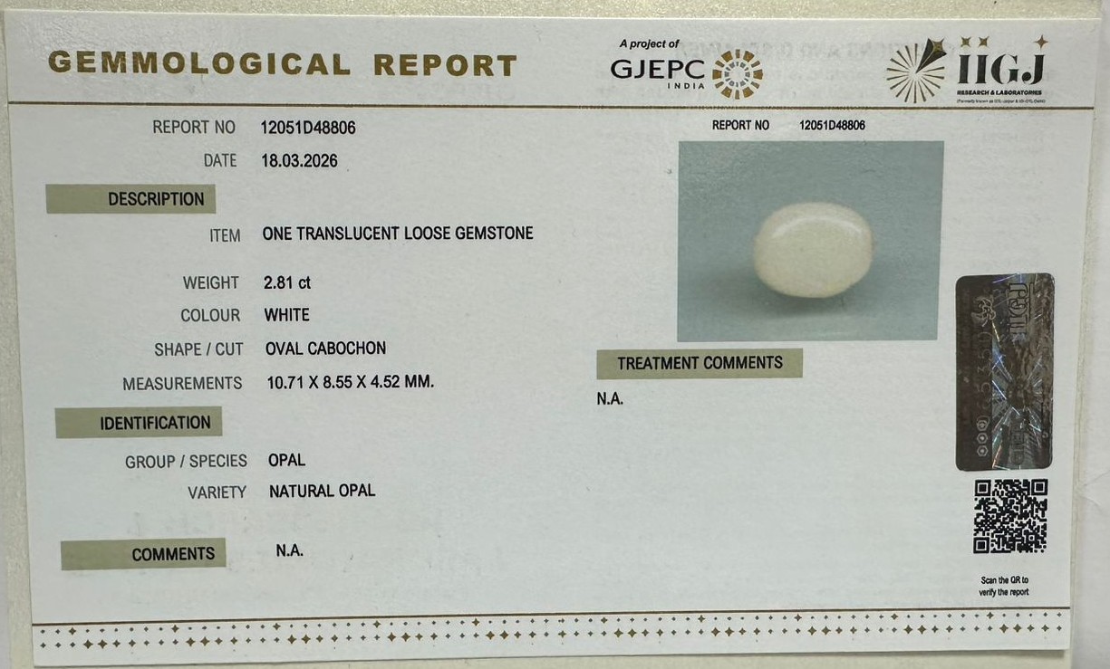 Beautiful 2.81 Cts Natural Opal (Top-Mines) sva 3+ Ratti OPAL. Free Horoscope & Free Pundit Ji Astrological Advise / Consultation. Original Natural Lab certified gems by IGI GTL / Birth stones / Large Gem Selection of shree shubh Rashi Ratan Vedic dhan at Gem Mines. May Bhagwan Brahma, Vishnu, Shiv & Universe bless you.