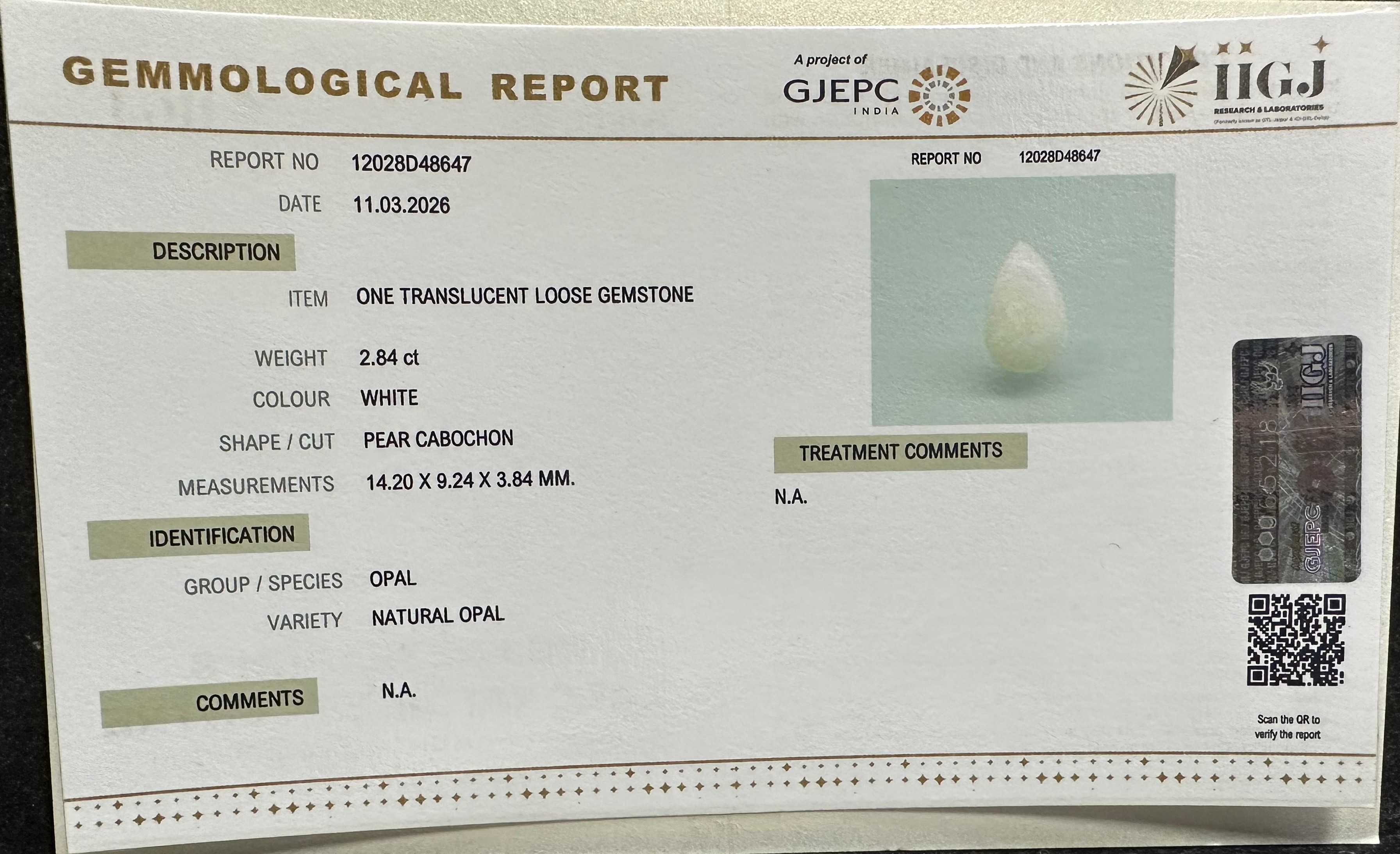 Beautiful 2.84 Cts Natural Opal (Top-Mines) sva 3+ Ratti OPAL. Free Horoscope & Free Pundit Ji Astrological Advise / Consultation. Original Natural Lab certified gems by IGI GTL / Birth stones / Large Gem Selection of shree shubh Rashi Ratan Vedic dhan at Gem Mines. May Bhagwan Brahma, Vishnu, Shiv & Universe bless you.