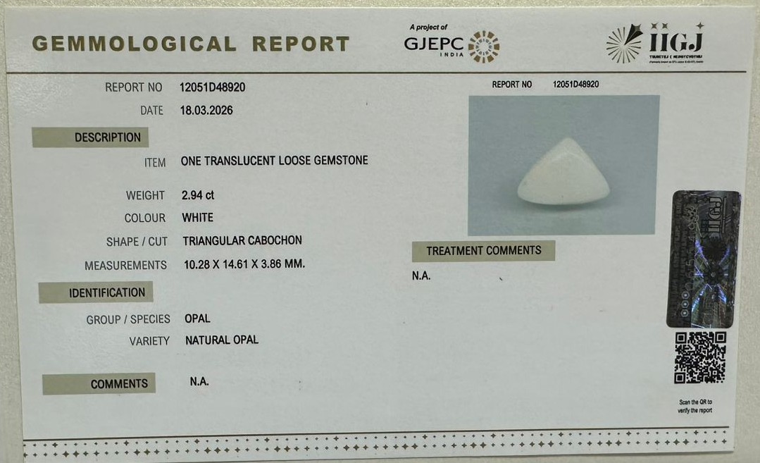 Beautiful 2.94 Cts Natural Opal (Very Good-Mines) sva 3+ Ratti OPAL. Free Horoscope & Free Pundit Ji Astrological Advise / Consultation. Original Natural Lab certified gems by IGI GTL / Birth stones / Large Gem Selection of shree shubh Rashi Ratan Vedic dhan at Gem Mines. May Bhagwan Brahma, Vishnu, Shiv & Universe bless you.