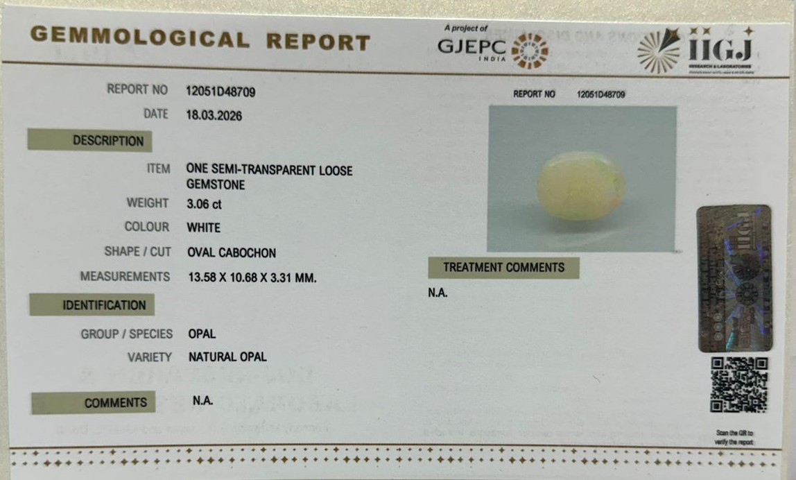 Beautiful 3.06 Cts Natural Opal (Top-Mines) sva 3+ Ratti OPAL. Free Horoscope & Free Pundit Ji Astrological Advise / Consultation. Original Natural Lab certified gems by IGI GTL / Birth stones / Large Gem Selection of shree shubh Rashi Ratan Vedic dhan at Gem Mines. May Bhagwan Brahma, Vishnu, Shiv & Universe bless you.