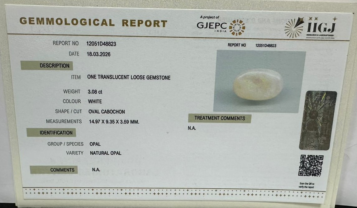 Beautiful 3.08 Cts Natural Opal (AAA+-Mines) sva 3+ Ratti OPAL. Free Horoscope & Free Pundit Ji Astrological Advise / Consultation. Original Natural Lab certified gems by IGI GTL / Birth stones / Large Gem Selection of shree shubh Rashi Ratan Vedic dhan at Gem Mines. May Bhagwan Brahma, Vishnu, Shiv & Universe bless you.