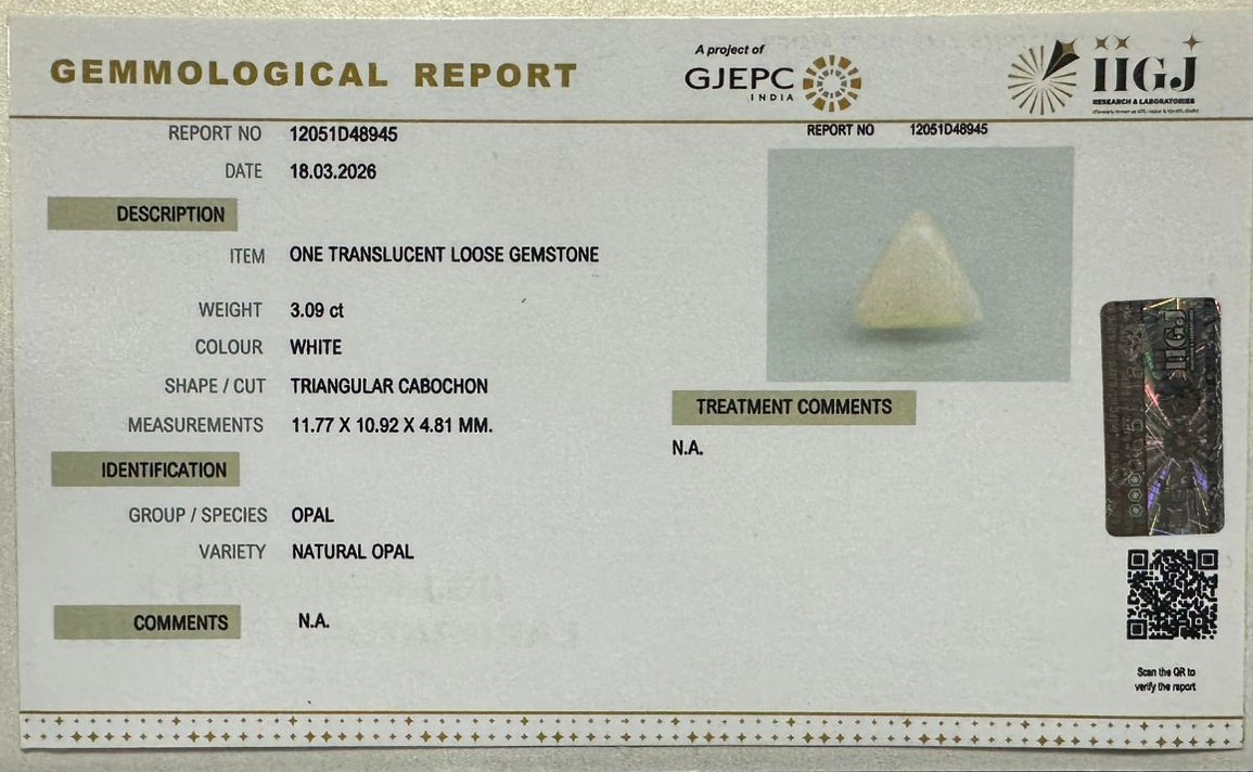 Beautiful 3.09 Cts Natural Opal (Top-Mines) sva 3+ Ratti OPAL. Free Horoscope & Free Pundit Ji Astrological Advise / Consultation. Original Natural Lab certified gems by IGI GTL / Birth stones / Large Gem Selection of shree shubh Rashi Ratan Vedic dhan at Gem Mines. May Bhagwan Brahma, Vishnu, Shiv & Universe bless you.